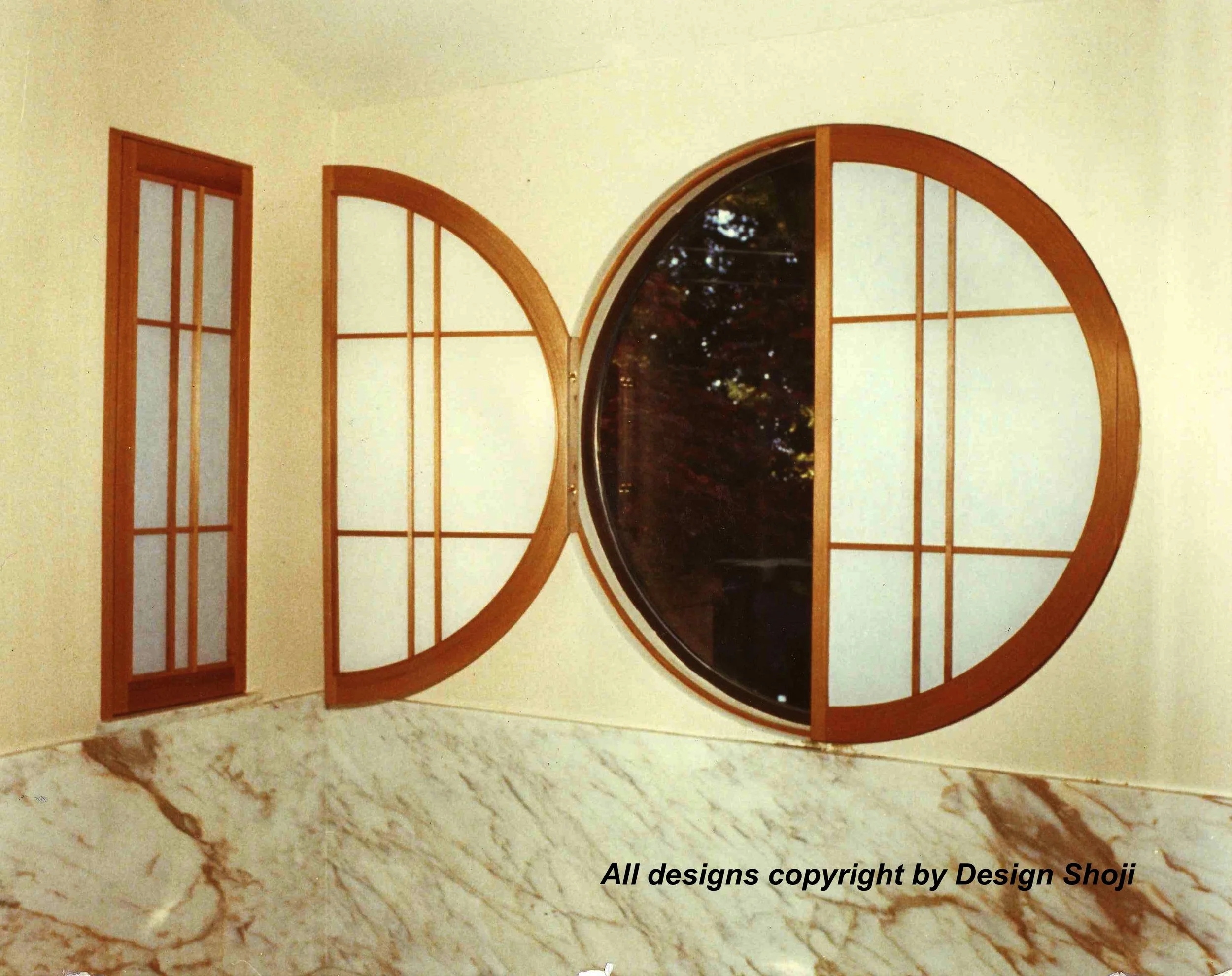 The masterbath windows shown below typify a Design Shoji installation. The shoji panels are mounted inside the window jambs to open up the space as much as possible, while providing complete privacy. A carefully laid out grid pattern gives the two shoji screens a similar feel, despite the different size and shape of the frames. Most importantly, the round shoji mounted within the jamb really accentuate the circular window.