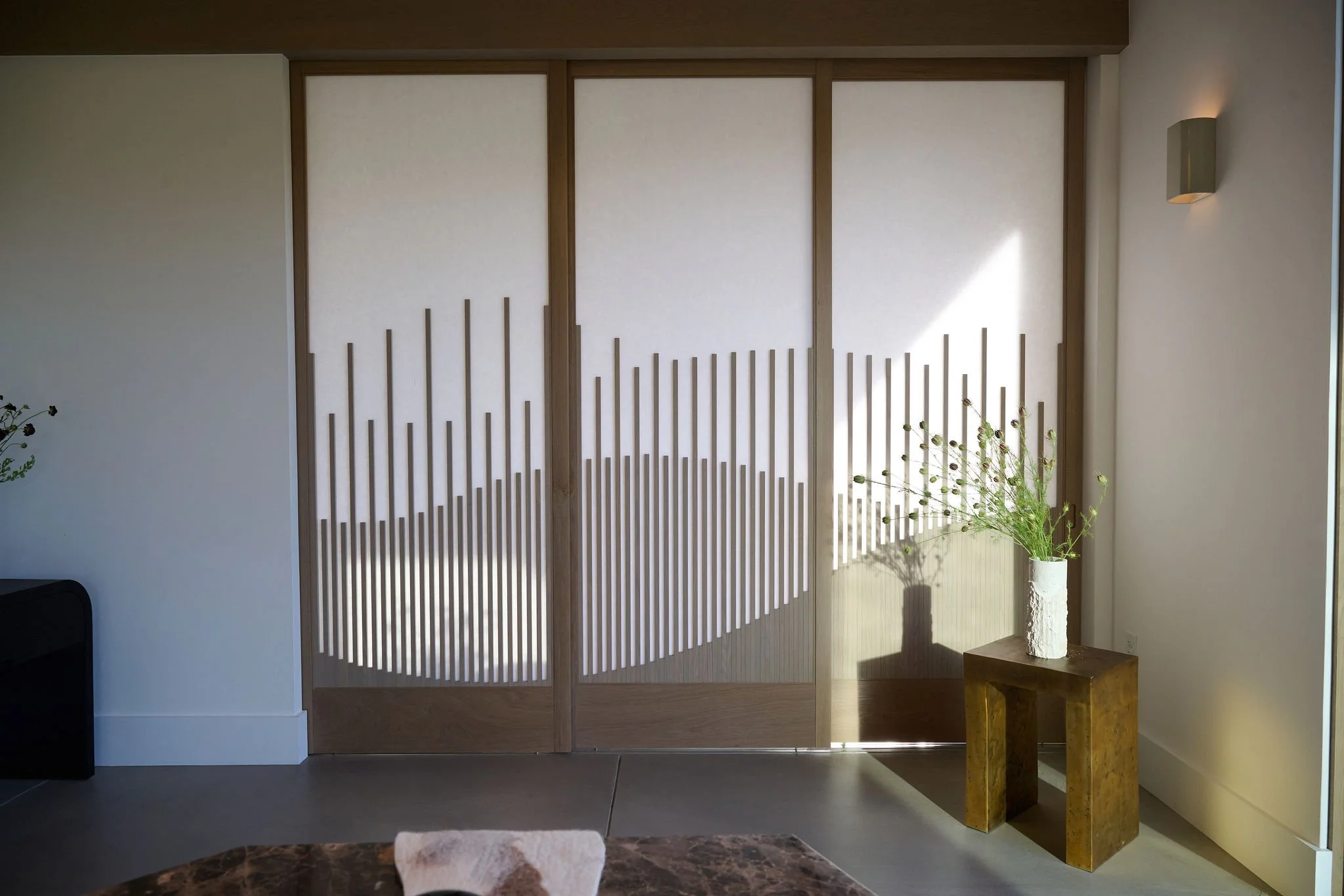 Sliding shoji separate the tasting rooms of this boutique Sonoma county winery, Kanzler Vineyards. RareField designed a gridwork that symbolizes the mountains around the vineyards. One major challenge with this build was to create panels that would maintain their shape for years to come without any horizontal supports in the grid pattern. After much forethought, many meetings and patient collaboration, we brought the design to life. Thank you, Steve Kanzler, for your trust in our work.