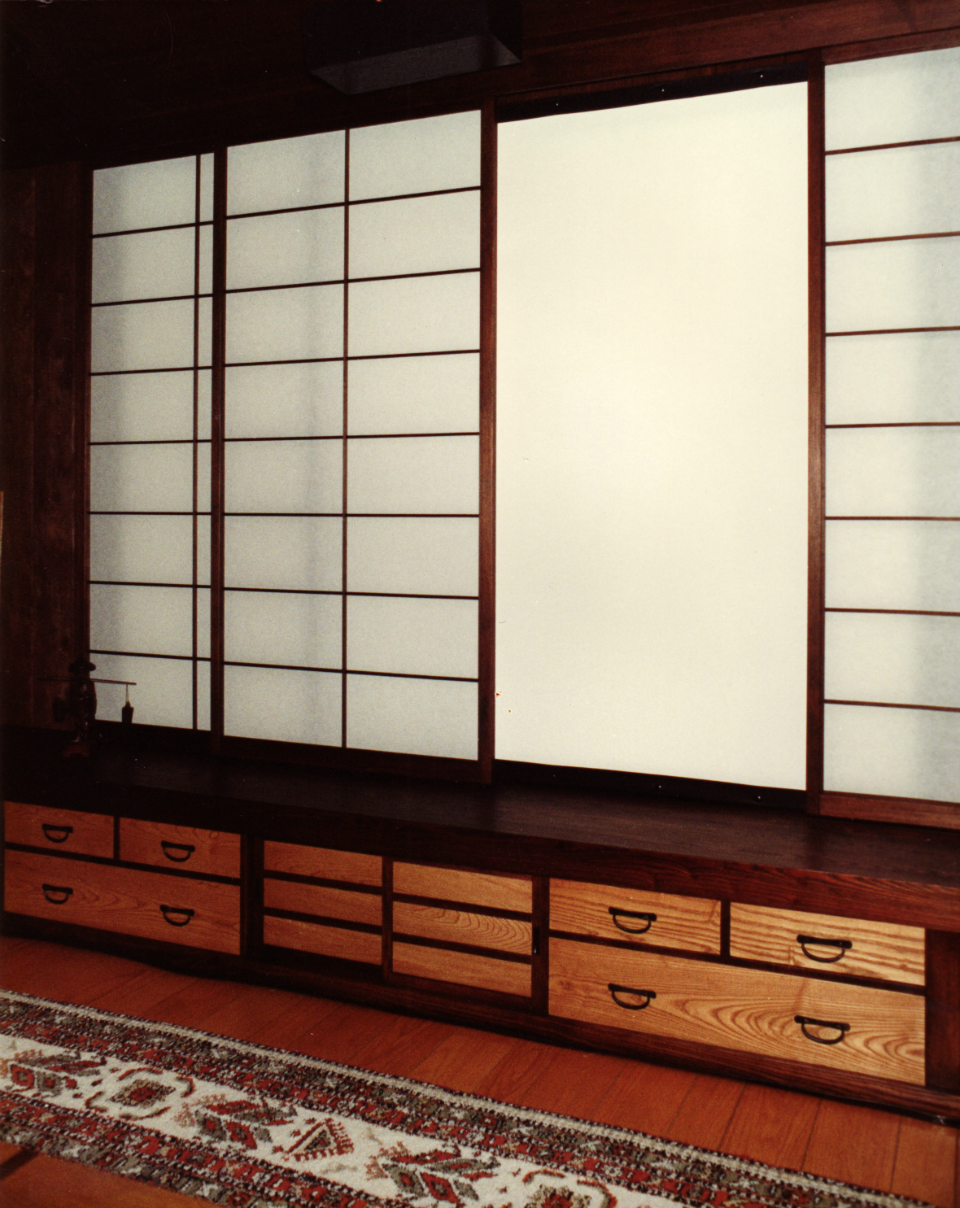 The light brown finish on the tansu doors was chosen to blend with the flooring, while the dark brown finish of the casework was a fun way to incorporate the big shoji doors into the unit. The bottom track for these shoji was recessed into the top of the tansu, but with the matching finish, is virtually invisible. The track was needed to help keep the shoji perfectly aligned when slid, as one would be reaching over the cabinet to move the panels.